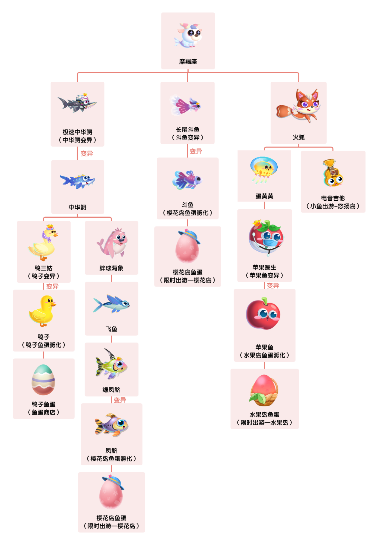 其中凤鲚鱼和斗鱼由樱花岛宝箱开出的樱花岛鱼蛋孵出;